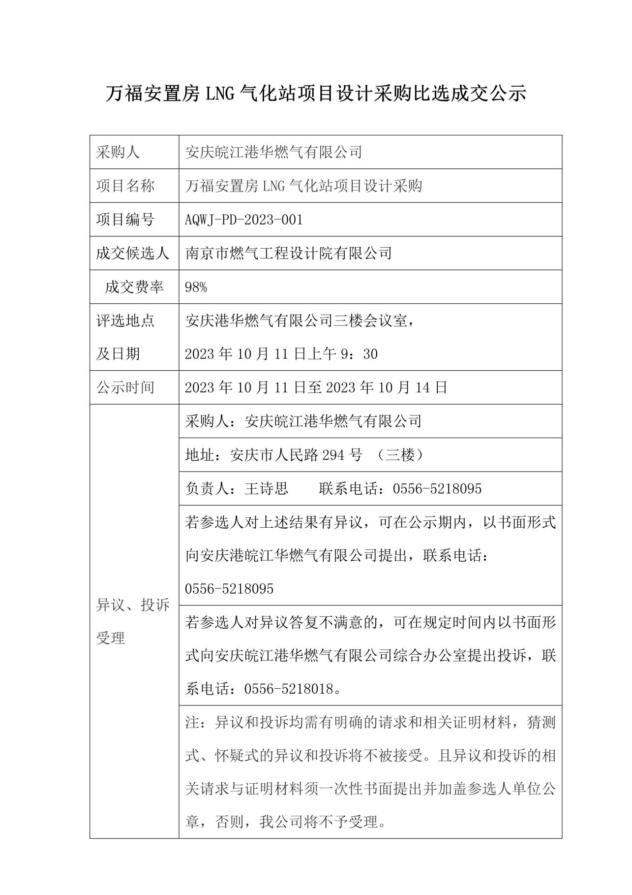 萬(wàn)福安置房LNG氣化站項(xiàng)目設(shè)計(jì)采購(gòu)比選成交公示