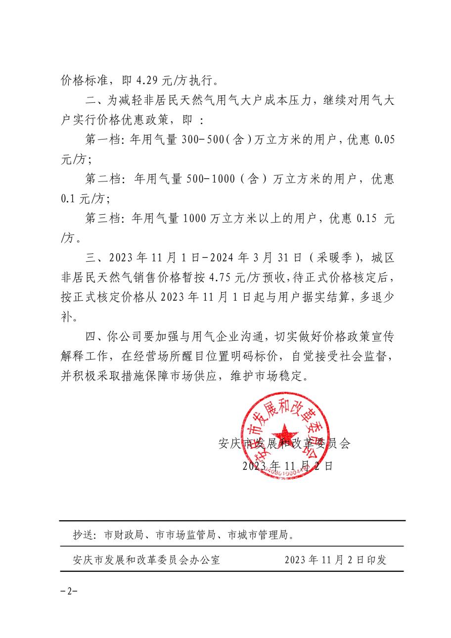 安慶市發(fā)展改革委關(guān)于順價疏導(dǎo)市城區(qū)淡季非居民天然氣銷售價格的補充通知