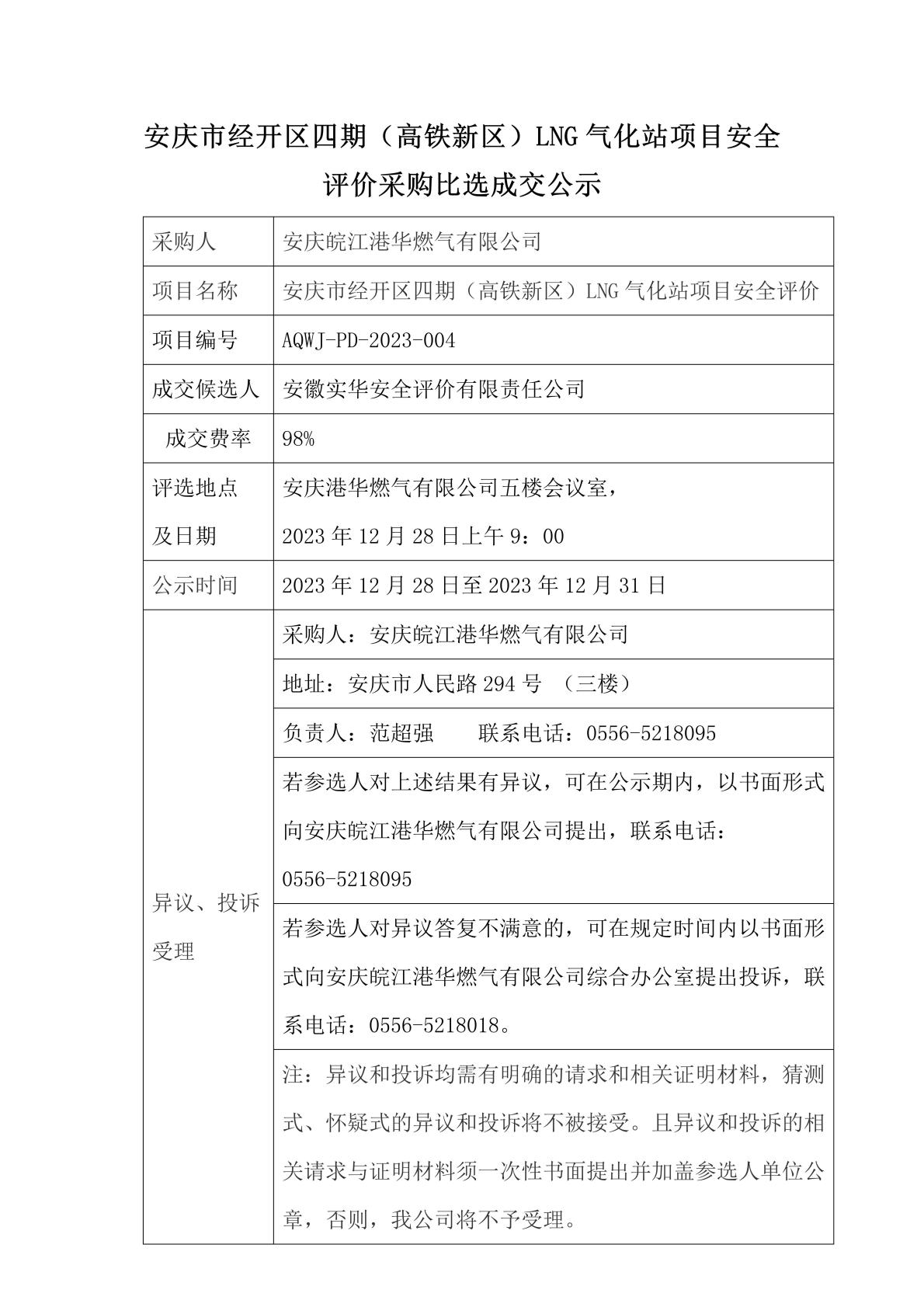 安慶市經(jīng)開(kāi)區(qū)四期(高鐵新區(qū))LNG氣化站項(xiàng)目安全評(píng)價(jià)采購(gòu)比選成交公示
