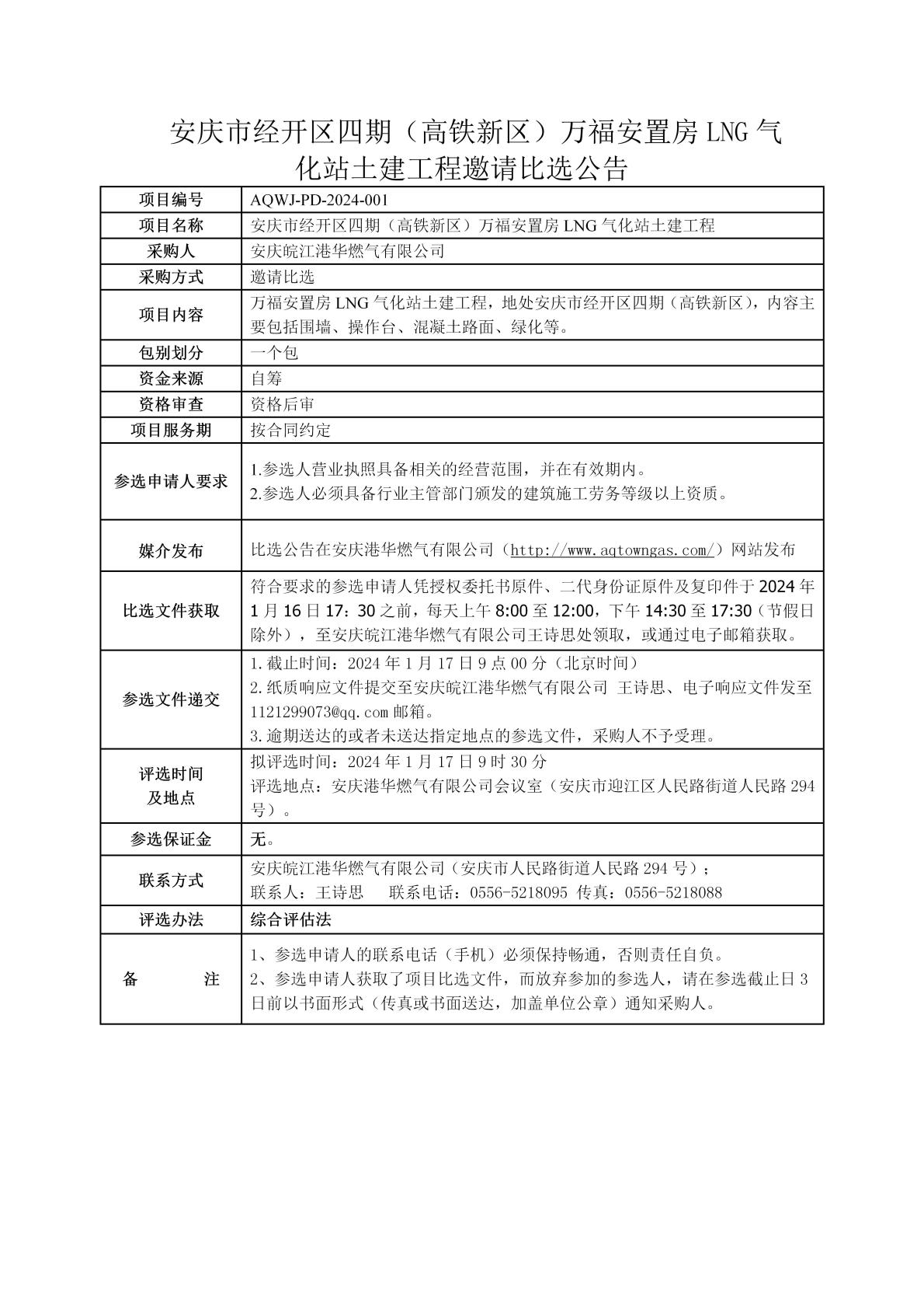 安慶市經(jīng)開(kāi)區(qū)四期(高鐵新區(qū))萬(wàn)福安置房LNG氣化站土建工程邀請(qǐng)比選公告