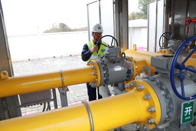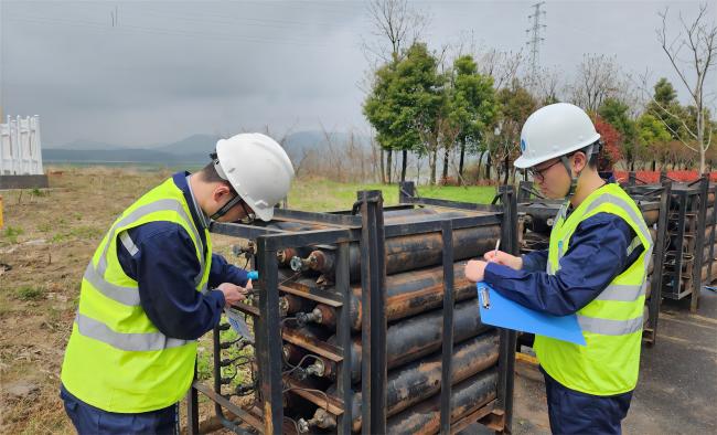12時(shí)08分,置換作業(yè)開(kāi)始。確定管道內(nèi)氣體成分比例符合要求后,置換組緩慢開(kāi)啟1號(hào)閥門(mén),向管網(wǎng)內(nèi)輸送天然氣,并由調(diào)度中心對(duì)管網(wǎng)內(nèi)壓力情況跟進(jìn)、監(jiān)測(cè)。正午時(shí)分,驕陽(yáng)似火,檢測(cè)人員們一邊吃著盒飯一邊堅(jiān)守施工現(xiàn)場(chǎng)觀測(cè)數(shù)據(jù)。終于,14時(shí)16分,現(xiàn)場(chǎng)調(diào)度的對(duì)講機(jī)內(nèi)傳來(lái)放散塔檢測(cè)人員的聲音:“經(jīng)檢測(cè),管網(wǎng)內(nèi)燃?xì)夂恳堰_(dá)99.7%,置換合格?!?