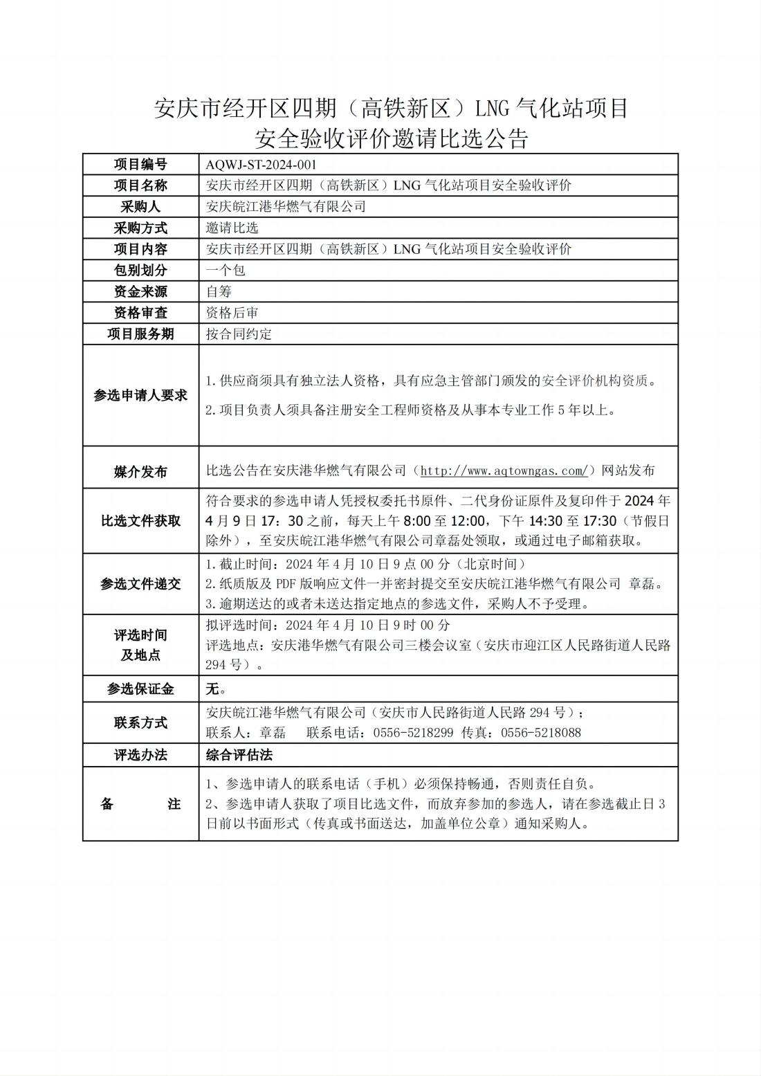 安慶市經(jīng)開區(qū)四期(高鐵新區(qū))LNG 氣化站項目安全驗收評價邀請比選公告