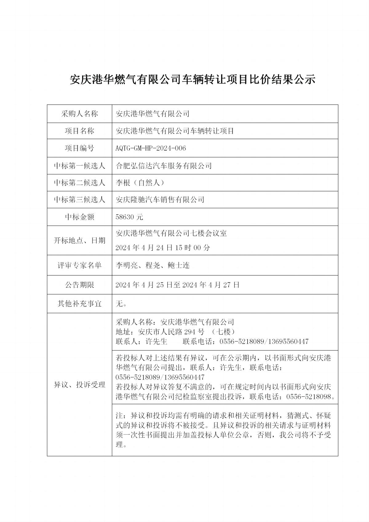 安慶港華燃氣有限公司車輛轉(zhuǎn)讓項目比價結(jié)果公示