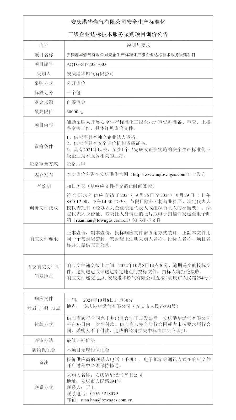 安慶港華燃?xì)庥邢薰景踩a(chǎn)標(biāo)準(zhǔn)化三級(jí)企業(yè)達(dá)標(biāo)技術(shù)服務(wù)采購項(xiàng)目詢價(jià)公告