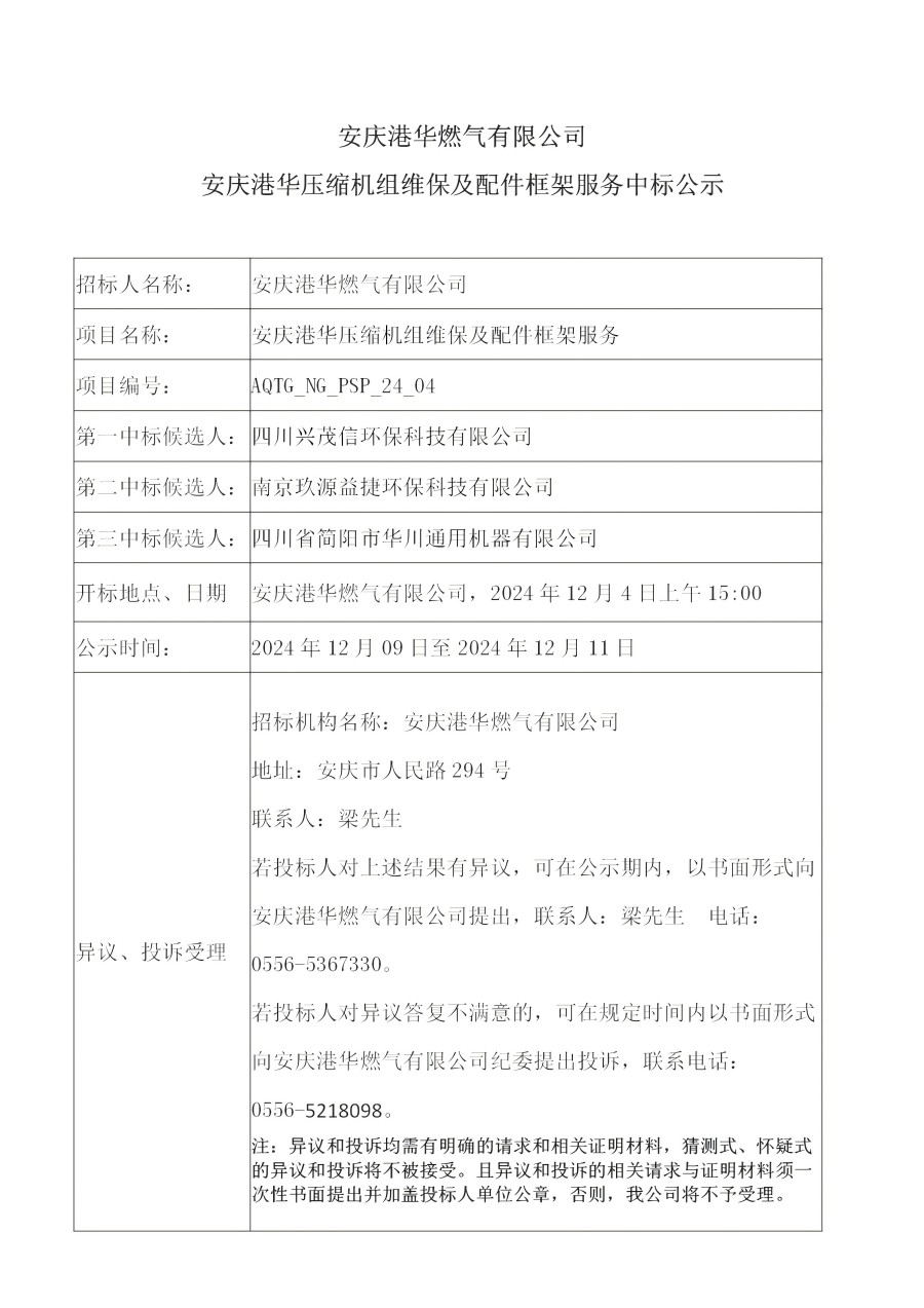 安慶港華燃氣有限公司安慶港華壓縮機組維保及配件框架服務(wù)中標公示