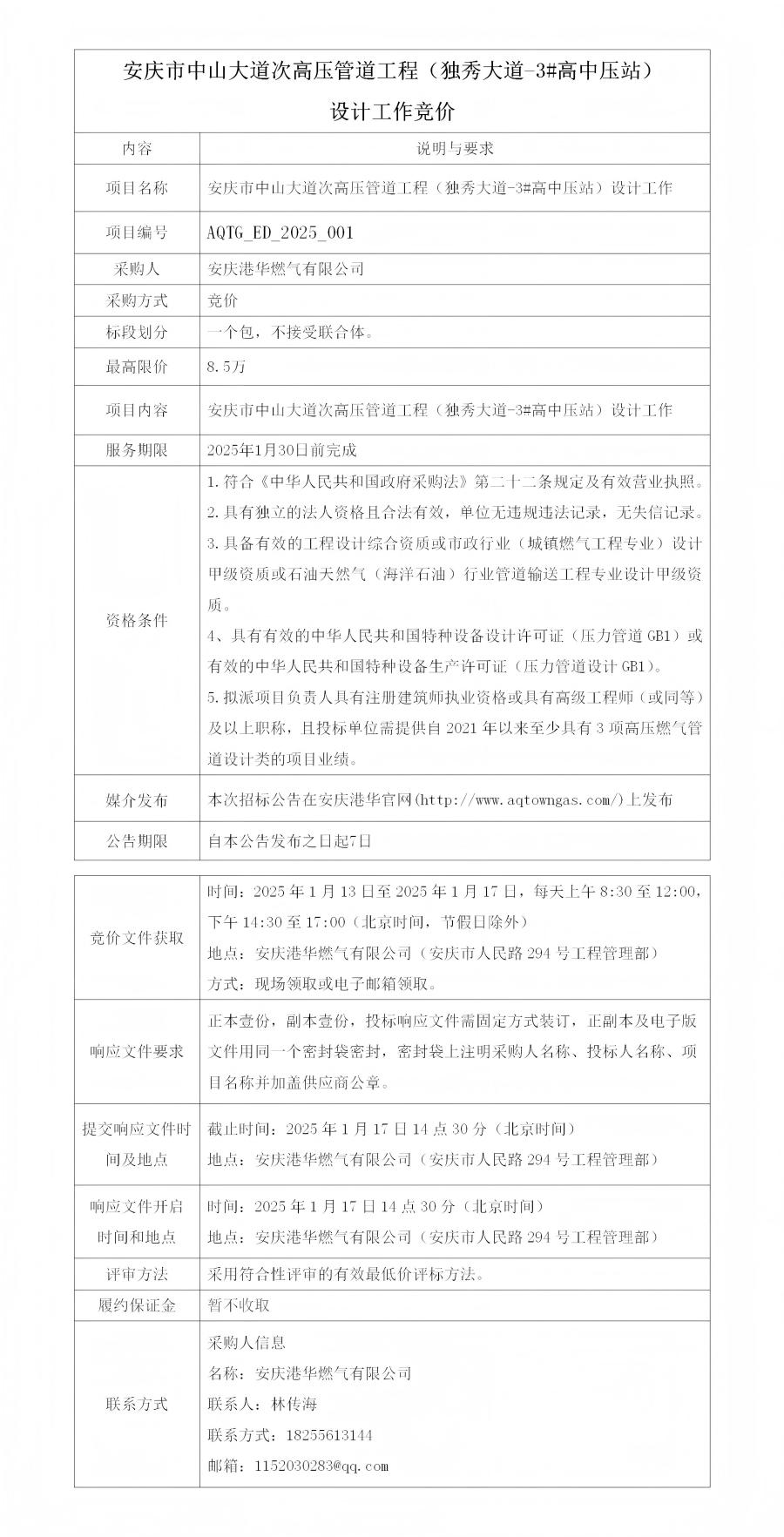 安慶市中山大道次高壓管道工程(獨秀大道-3#高中壓站)設計工作競價