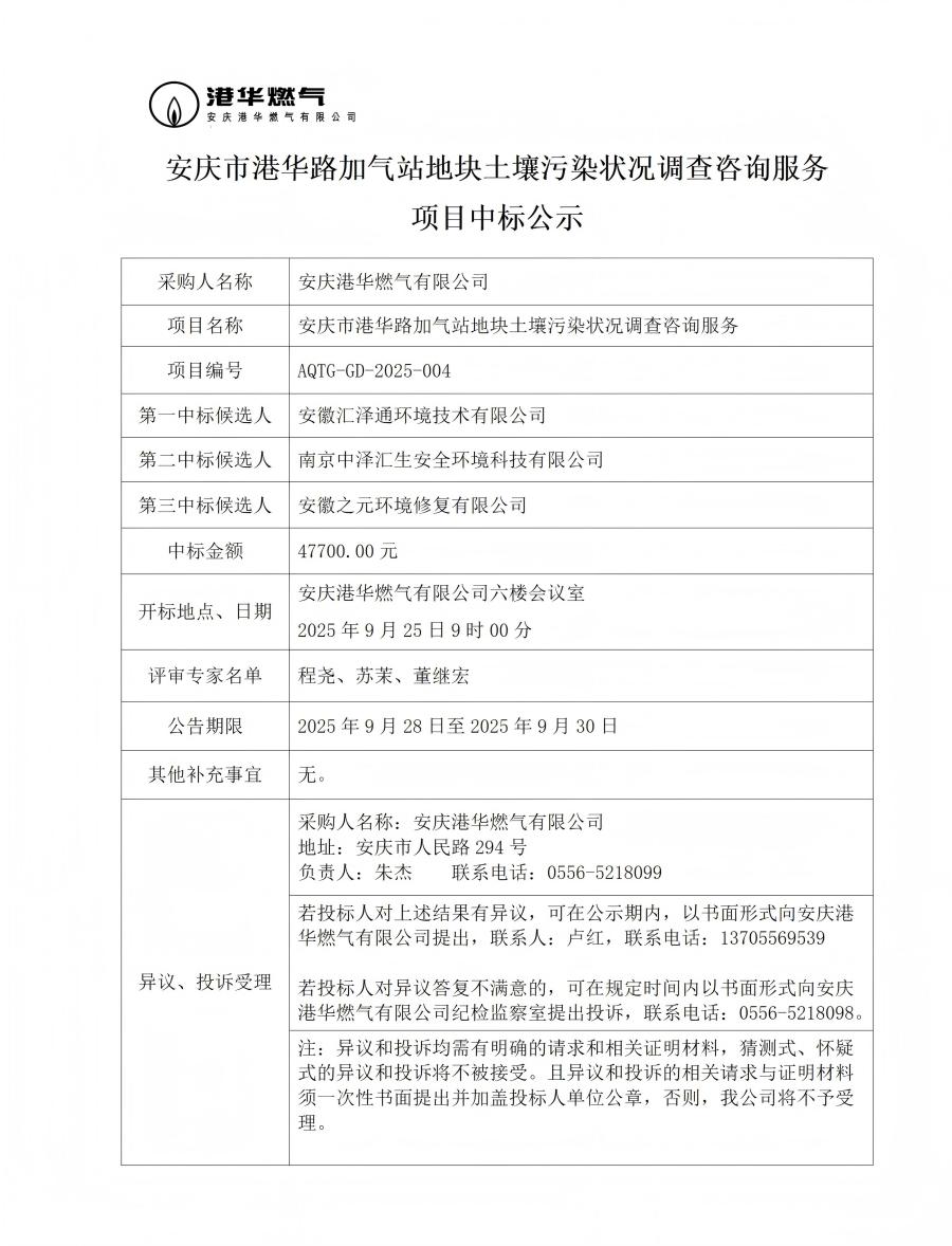 安慶市港華路加氣站地塊土壤污染狀況調(diào)查咨詢(xún)服務(wù)項(xiàng)目中標(biāo)公示
