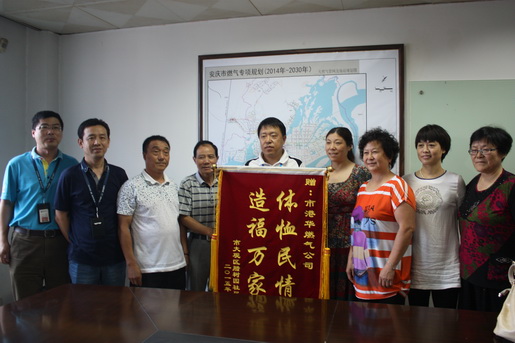 7月16日下午,市大觀區(qū)臘樹(shù)園社居委工作人員及部分社區(qū)居民代表將一份“體恤民情、造福萬(wàn)家”錦旗送到安慶港華,感謝安慶港華在臘樹(shù)園燃?xì)夤こ探ㄔO(shè)中付出的努力。