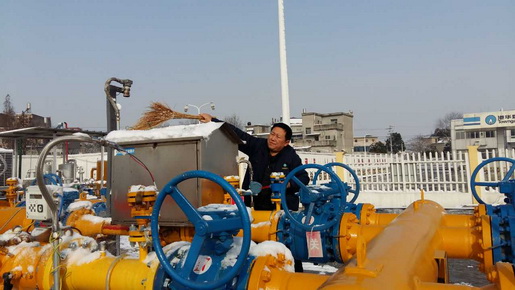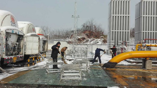 圖為1月23日,LNG釋放站工作人員在進(jìn)行儲(chǔ)罐倒罐作業(yè)、清掃積雪